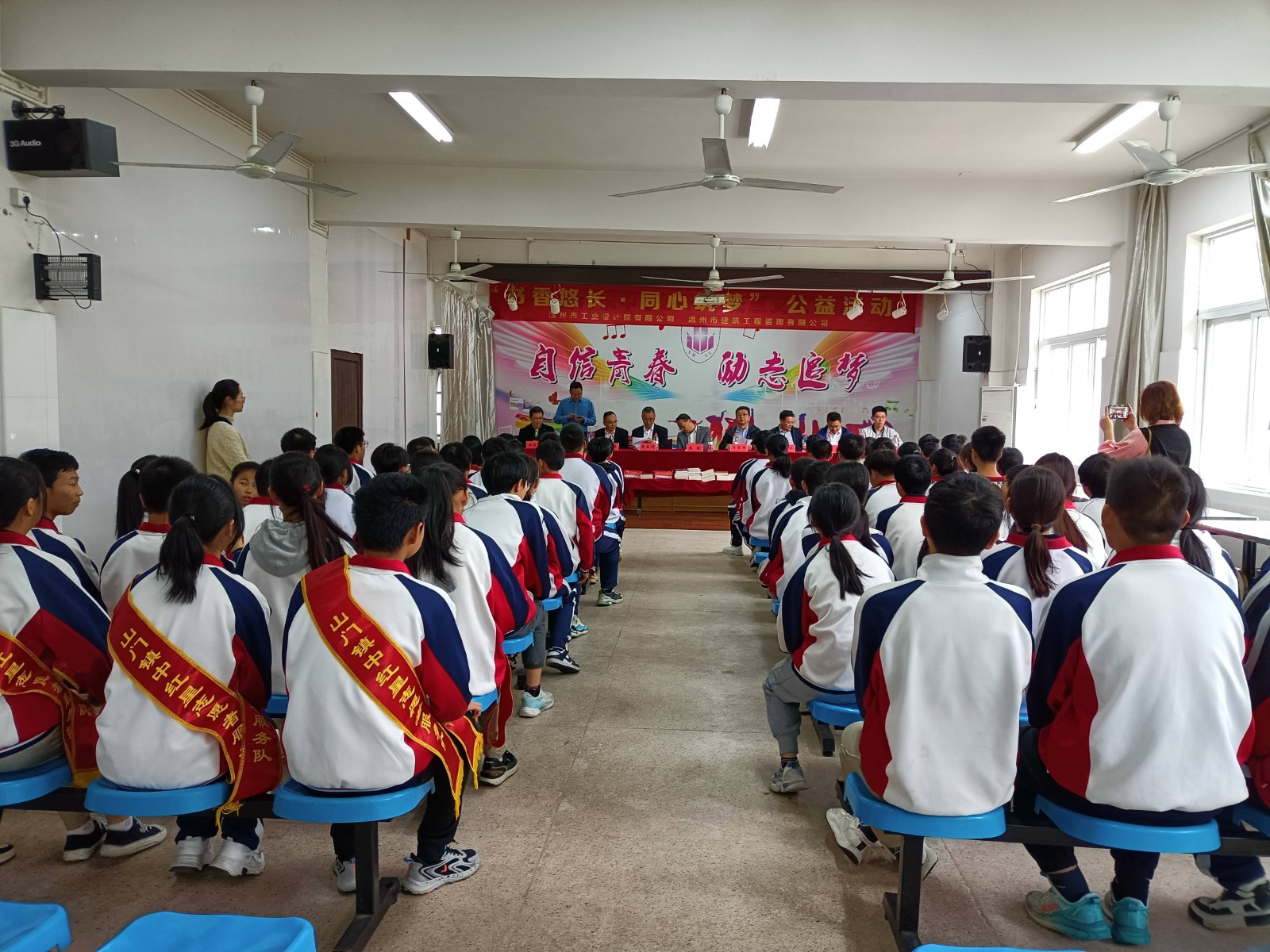 本次活動(dòng)在雄偉莊嚴(yán)的國(guó)歌聲中拉開了帷幕,山門鎮(zhèn)黨委副書記、鎮(zhèn)長(zhǎng)蘇斌,山門鎮(zhèn)初級(jí)中學(xué)書記、校長(zhǎng)蘇連福首先對(duì)工業(yè)院、建設(shè)咨詢公司一行的到來(lái)表示歡迎,對(duì)兩支部關(guān)心老區(qū)教育,心系老區(qū)學(xué)子,熱心公益事業(yè)致以衷心的感謝。蘇斌表示,學(xué)校今后將大力開展閱讀活動(dòng),努力打造書香校園,希望學(xué)生們通過(guò)閱讀打開通往世界的大門。同時(shí),他教導(dǎo)學(xué)生們要以感恩之心暢享閱讀、沐浴書香,以優(yōu)異的成績(jī)來(lái)報(bào)答社會(huì)的關(guān)愛(ài)之情。